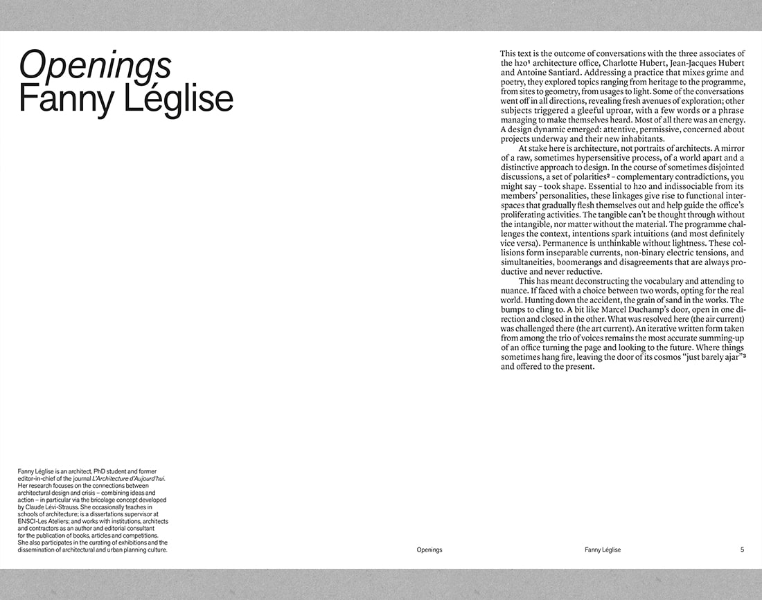 Ce livre est la première monographie consacrée à h2o architectes. Fondée par Charlotte Hubert, Jean-Jacques Hubert et Antoine Santiard, h2o architectes est une agence parisienne qui travaille sur des projets de natures et d'échelles variées, passant du logement à l'espace public et aux équipements culturels. L'agence est composée d’architectes et d’architectes du patrimoine.