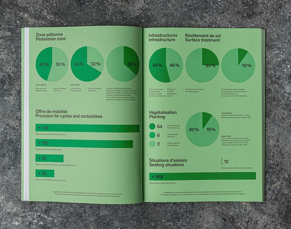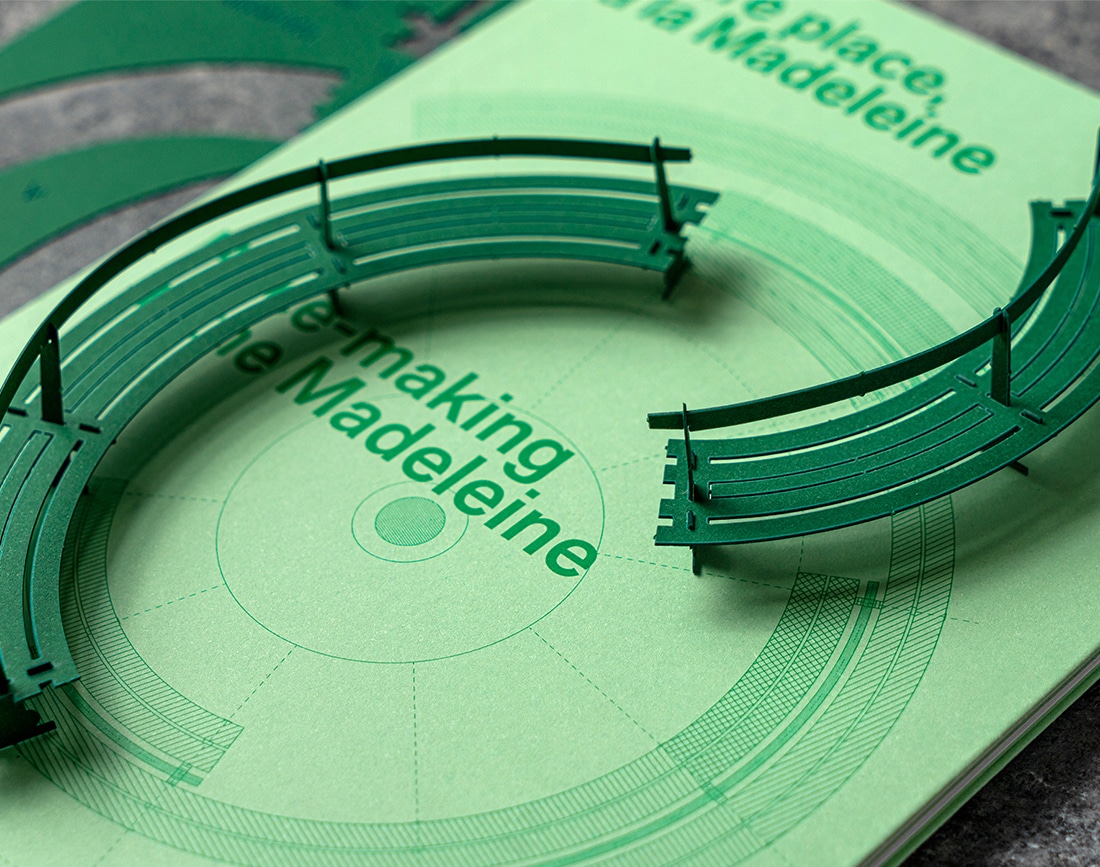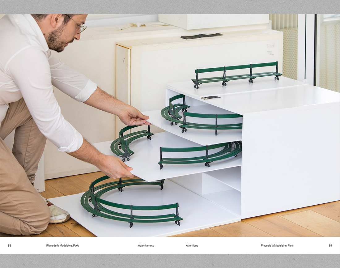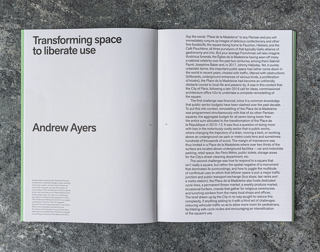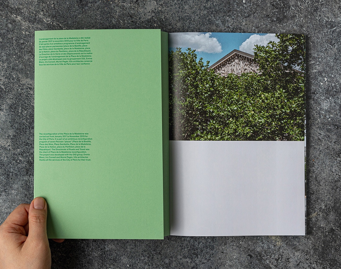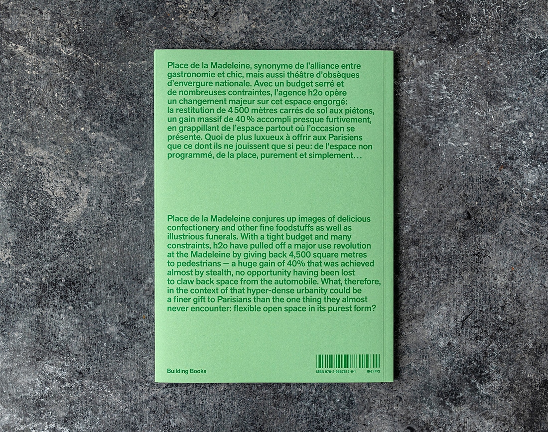 Ce deuxième livre d’une collection d’ouvrages monographiques consacrée à des projets de h2o architectes revient sur la place de la Madeleine, synonyme de l’alliance entre gastronomie et chic, mais aussi théâtre d’obsèques d’envergure nationale. Avec un budget serré et de nombreuses contraintes, l’agence h2o architectes opère un changement majeur sur cet espace engorgé : la restitution de 4?500 mètres carrés de sol aux piétons, un gain massif de 40% accompli presque furtivement, en grappillant de l’espace partout où l’occasion se présente. Quoi de plus luxueux à offrir aux Parisiens que ce dont ils ne jouissent que si peu : de l’espace non programmé, de la place, purement et simplement…
